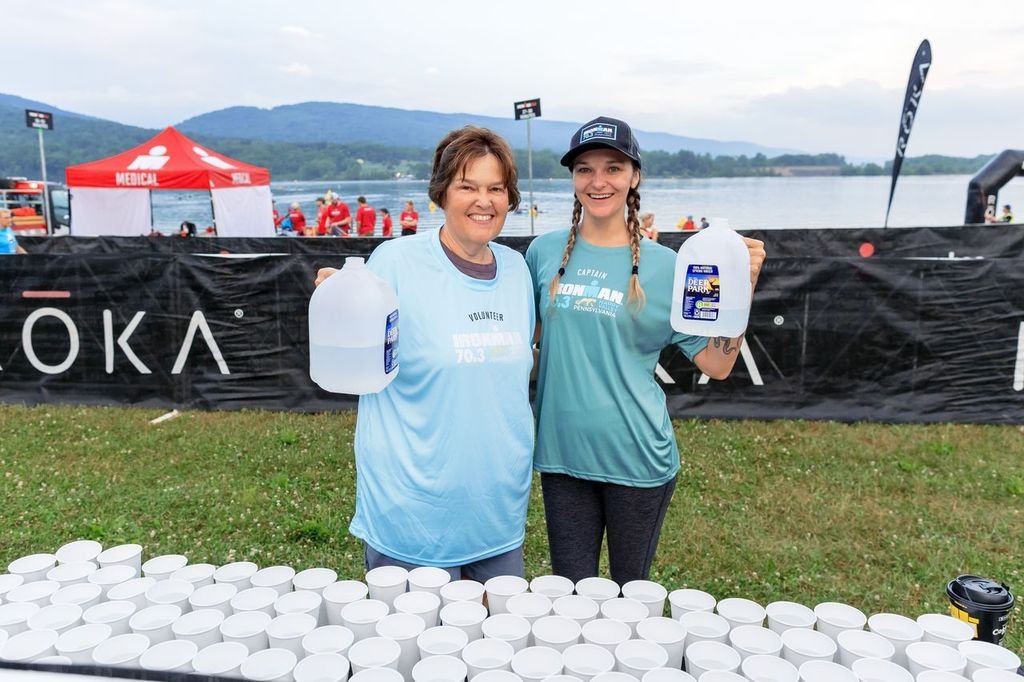 Volunteers handing out water during IRONMAN® event